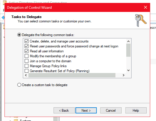 Open the Delegation of Control Wizard by right-clicking the domain Active Directory Users and Computers, and selecting All Tasks.