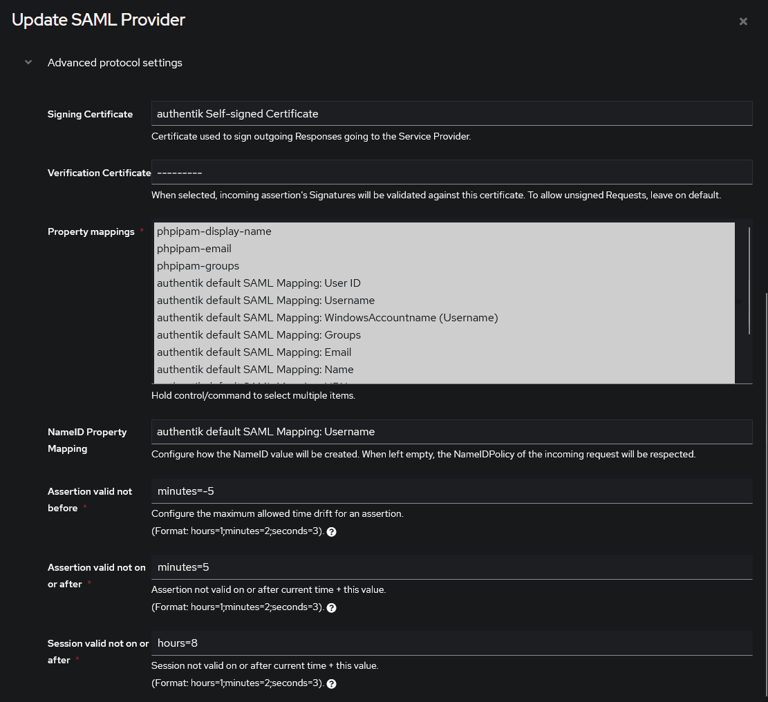 - NameID Property Mapping: authentik default SAML Mapping: Username