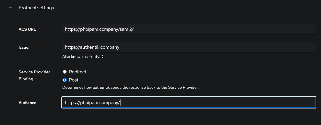 - IDP Login url: https://authentik.company/application/saml/application_name/sso/binding/redirect/