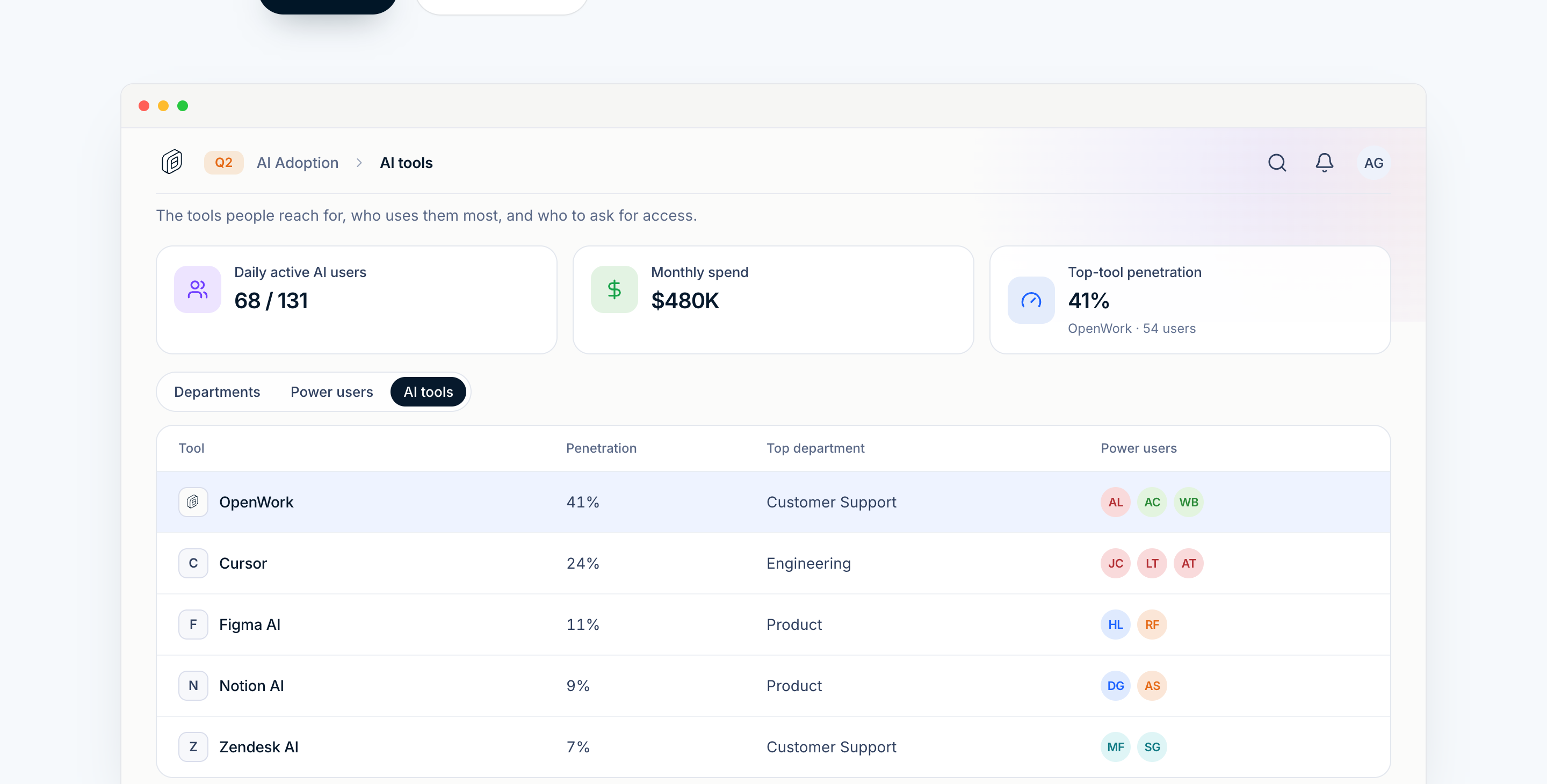Replaces the static /enterprise-hero.png on the /enterprise page with a live React component (LandingEnterpriseHero) that renders the same dashboard as an interactive leaderboard with three tabs. - Departments: flat list (no technical/business split). Adoption-trend sparkline per team, colored green/gray/red by direction. Engineering now absorbs former Data Science (48/82, \$330K, JC+LT+AL+5). Customer Support trending up, Legal falling to zero. - Power users: 7 famous scientists/programmers/businesspeople with cumulative weekday trend sparklines whose shape encodes personality (Carmack's bursts, Turing's scheduled-automation linearity, Hopper removed, Lovelace's early- adopter flattening, Carnegie's late ramp, etc.). Tools: Zed (Carmack), Omarchy (Linus), Hugging Face (Lovelace), Claude Code (Turing). - AI tools: tool, penetration, top department, and power-user avatars colored by each person's home department so viewers see cross-functional adoption at a glance. Interactivity kept minimal: row hover background for scan, tab color transitions, native title-attribute tooltips on avatars/tool glyphs/ sparklines. No fake animations. Header consolidated into a single row: OpenWork logo + Q2 pill + breadcrumb on the left, Search/Bell/AG on the right. Old wordmark and dead whitespace removed. Total hero height ~705px (down from 1018px). Screenshots under ee/apps/landing/screenshots/.