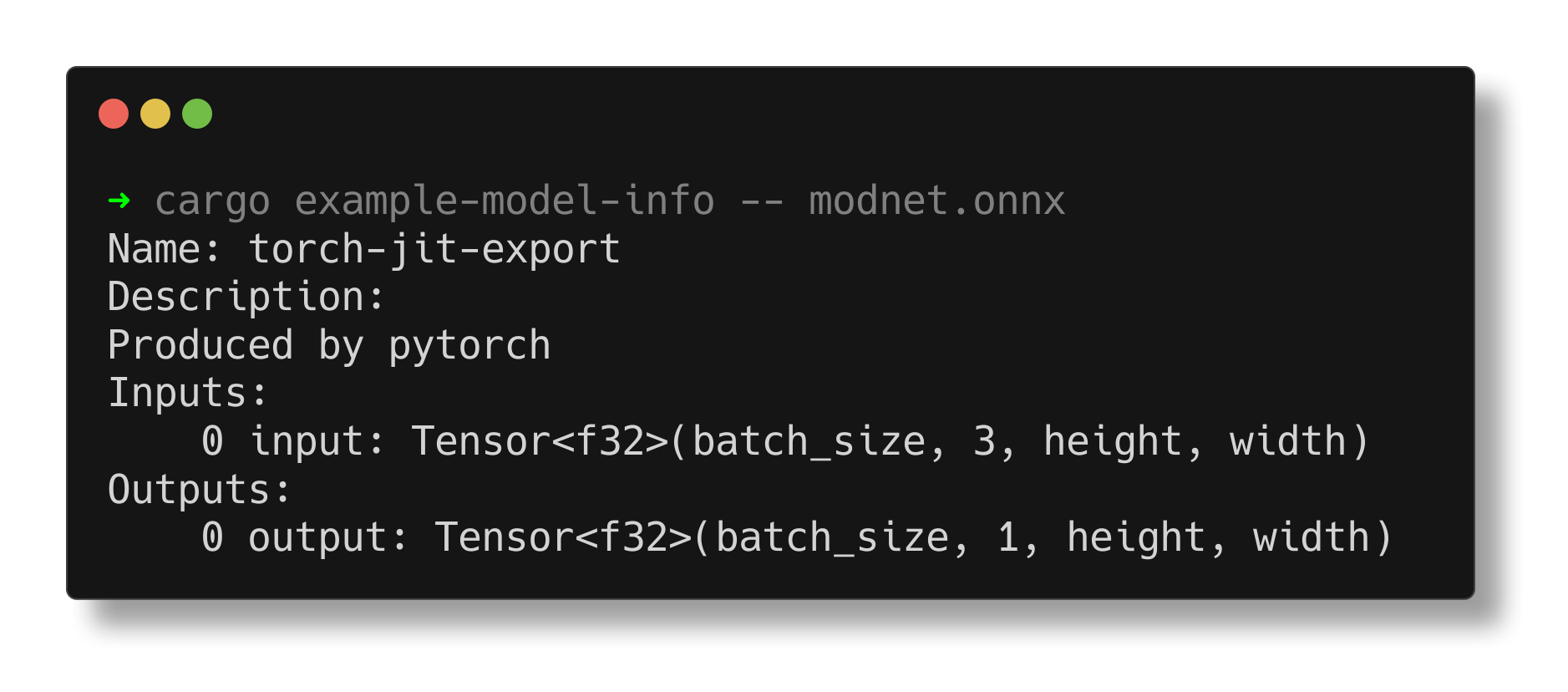 model-info is a simple application that prints a given model's metadata, as well as the shape & type of its inputs & outputs - like a mini, Rust-ified Netron!