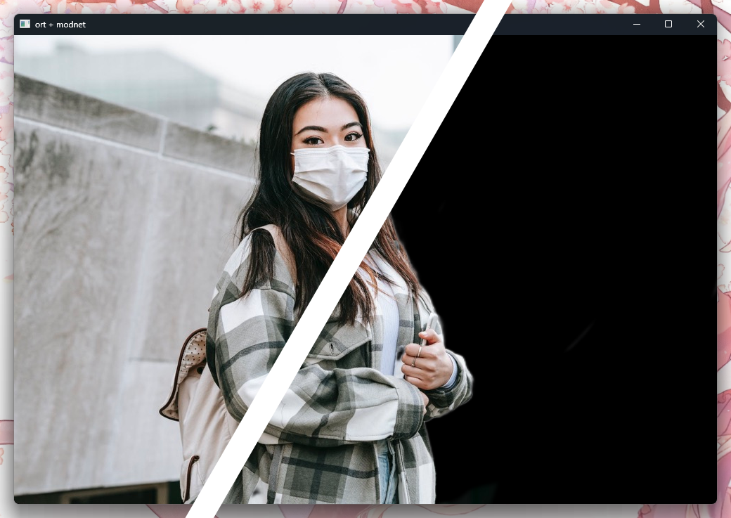 This example implements the MODNet model for portrait matting. Though this example uses a static image for simplicity, with ort and a hardware-accelerated execution provider, MODNet can be run in real-time! ⚡