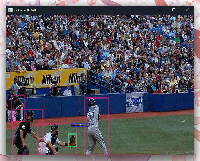 This example implements YOLOv8 object detection using ort. It features loading images with the image crate, converting them to ort tensors with ndarray, processing the inferred bounding boxes, and displaying them with show-image. YOLO's architecture makes it fairly simple to adapt this example to other YOLO versions, like YOLOv10/11.